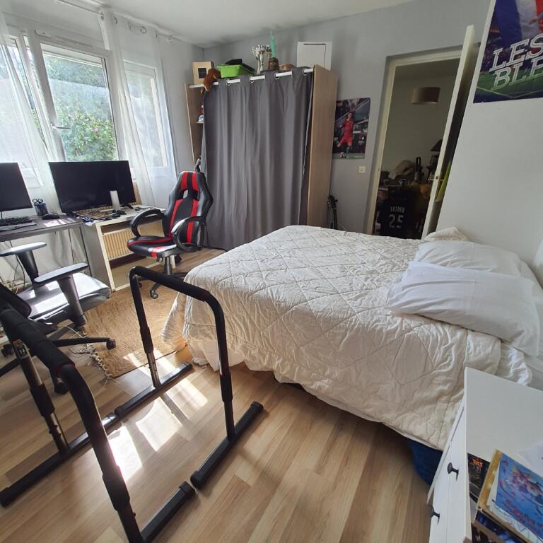DRANCY Appartement au rez de chaussée d'un pavillon/ Entrée, séjour, balcon, cuisine aménagée, 3 chambres, salle de bains, wc indépendant. Chauffage individuel gaz Cave jardin privatif et parking.